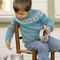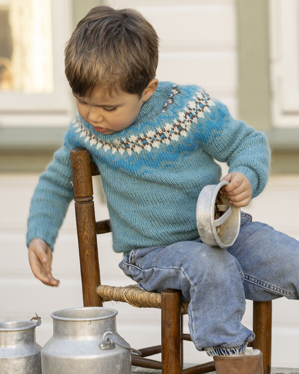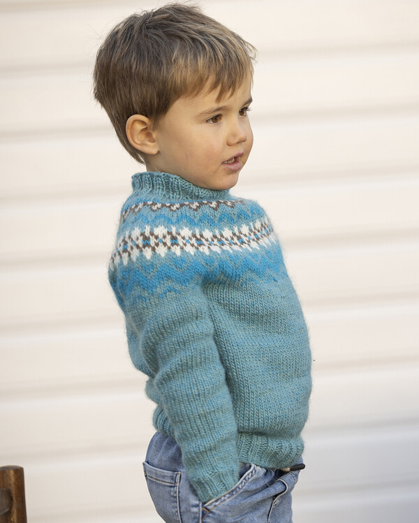 Strikk en myk og behagelig barnegenser med dette strikkemønsteret. Det klassiske flerfargemønsteret over bærestykket gir genseren et tidløst og sjarmerende uttrykk,