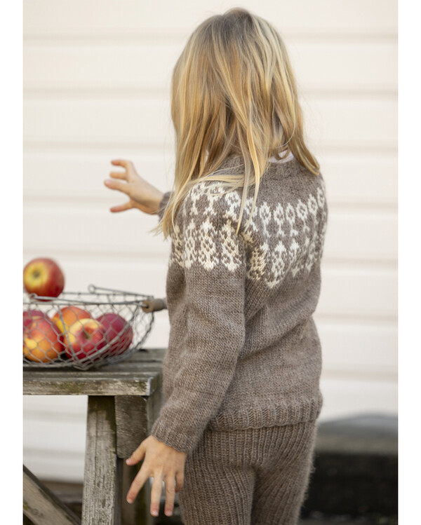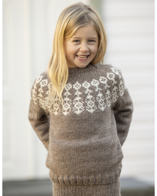 Strikk en myk og varm barnegenser med dette strikkemønsteret. Det klassiske mønsteret over bærestykket gir genseren et tidløst og harmonisk uttrykk,