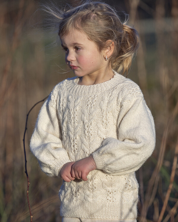 Strikk en myk og klassisk barnegenser med dette strikkemønsteret. De vakre flettene gir genseren et elegant og gjennomarbeidet uttrykk, mens den behagelige passformen gjør den deilig å ha på seg hele dagen.