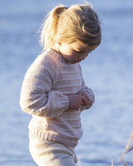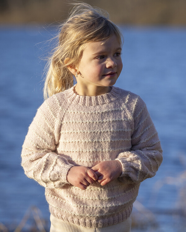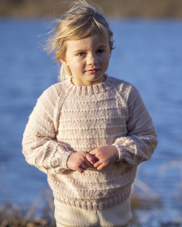En myk og tidløs strikket barnegenser med diskrete striper som gir et rolig og klassisk uttrykk. Den avrundede halsen og den smidige passformen gjør genseren behagelig både til hverdags og lek,