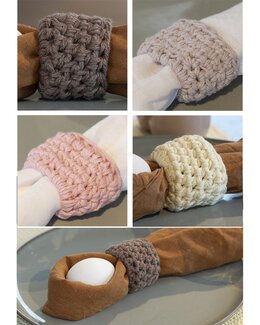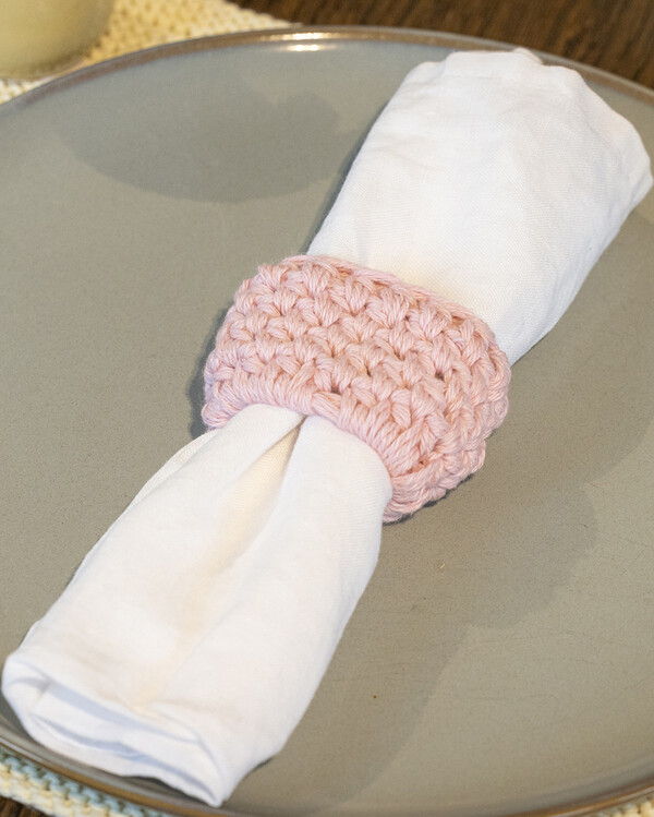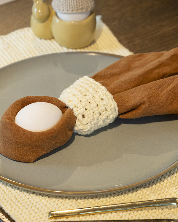 Et dekorativt heklemønster på serviettringer med struktur. De hekles i et tett mønster som gir en rustikk og håndlaget følelse til borddekkingen.