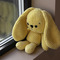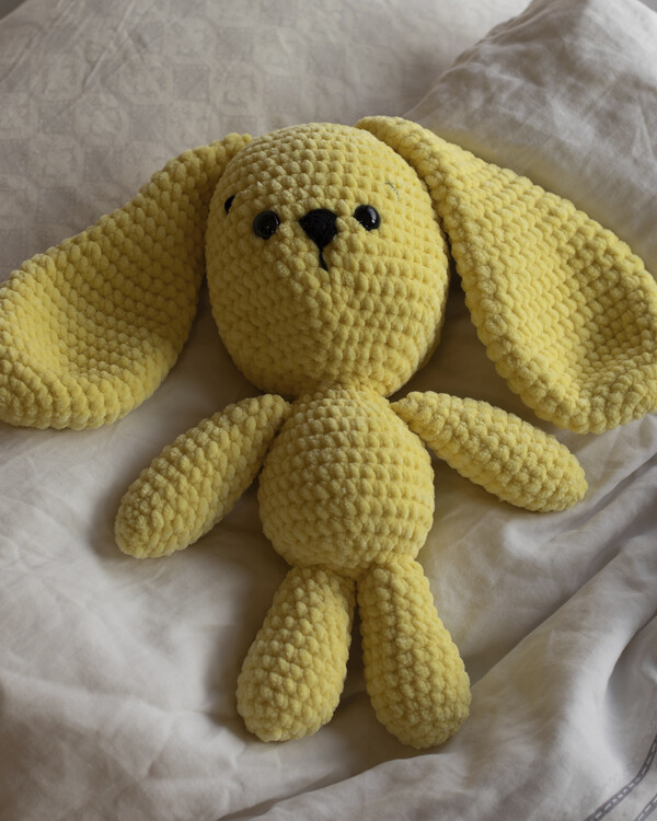 En søt heklet kanin med lange ører og myk kropp – perfekt for små hender å kose med.