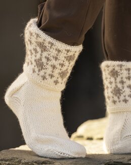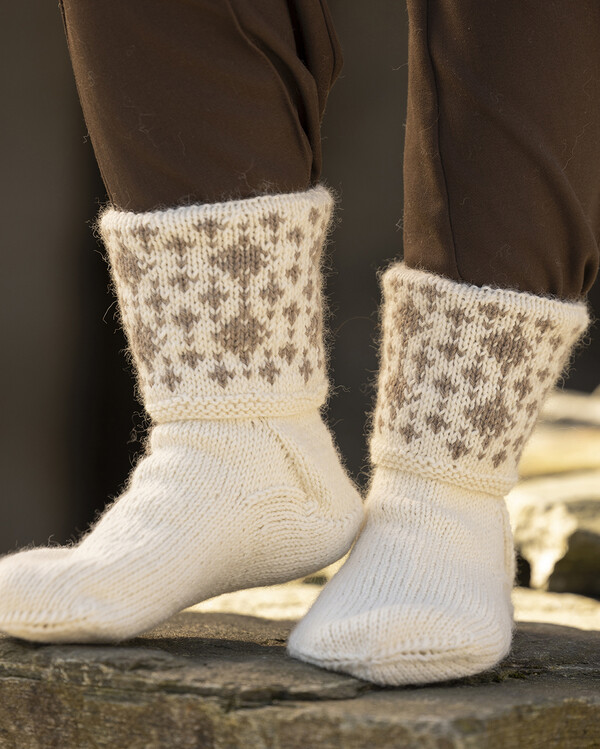 Et par strikkede sokker i fine, vinterlige farger som holder føttene varme og gode på kalde dager. Perfekte å trekke på ...