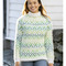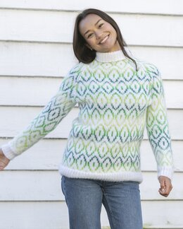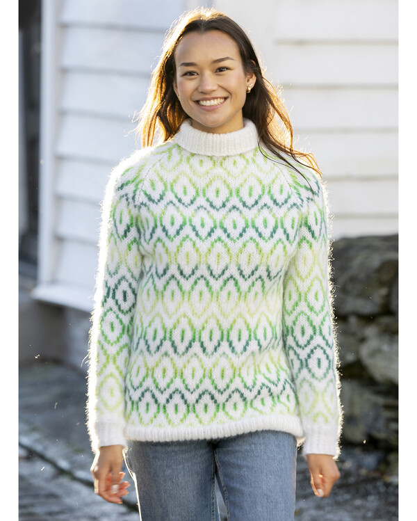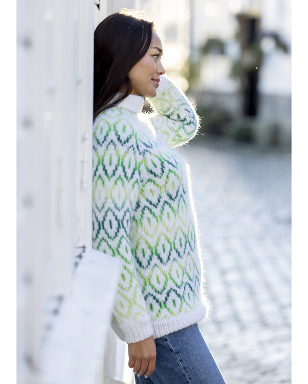 Strikk en lys og moderne genser med dette strikkemønsteret. Det grafiske flerfargemønsteret i grønne toner gir et friskt og nordisk uttrykk, mens den myke passformen og den høye kragen gjør genseren både behagelig og varm.