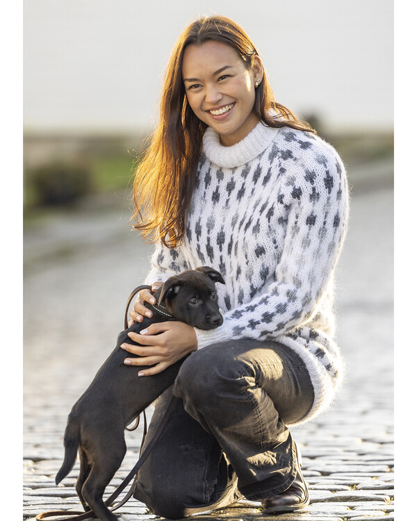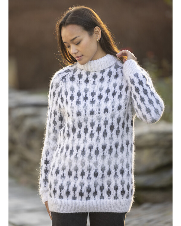 Strikk en elegant genser med mykt, gjentakende mønster i gråtoner. Den komfortable passformen og den høye ribbestrikkede halsen gir et tidløst og stilrent uttrykk.
