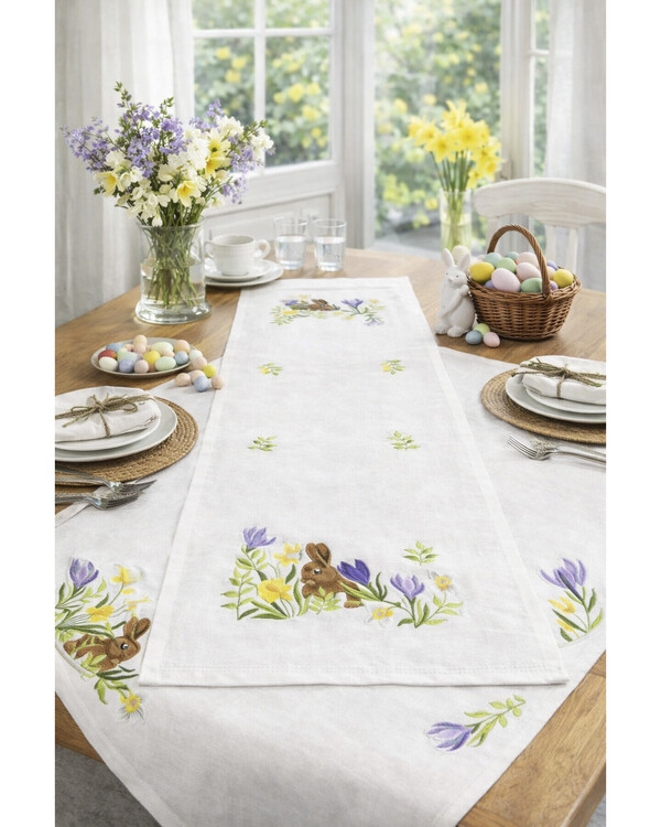 Det sjarmerende motivet med små kaniner, blomster og vårdetaljer gir en myk og leken følelse som passer perfekt til påskens borddekking. Motivet er tegnet på 100% bomullsvev, noe som gjør det enkelt å følge og gir et fint og jevnt resultat.