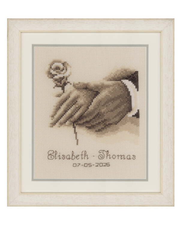 Broderes med moulinégarn i utregnede kors- og attersting på ekryfarget aidavev, 5,4 ruter/cm. Alfabet samt perler inngår. Motivmål 16x18 cm.