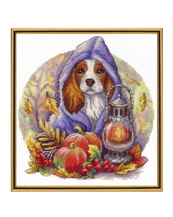 Motivet gir en herlig høstfølelse, varme og trygghet, og passer perfekt som broderibilde i høst- og vintersesongen eller som gave til hundeelskere.