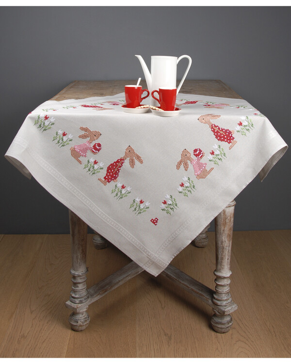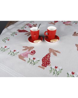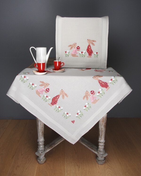 Broder denne fantastiske duken med søte harer blant tulipaner! Pynt hjemmet ditt med denne, eller hvorfor ikke overraske en god venn?