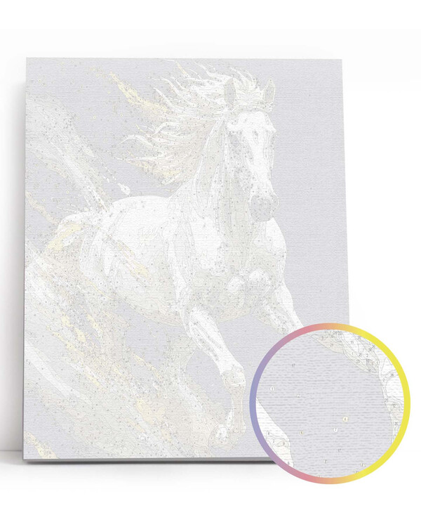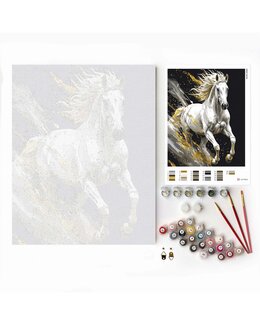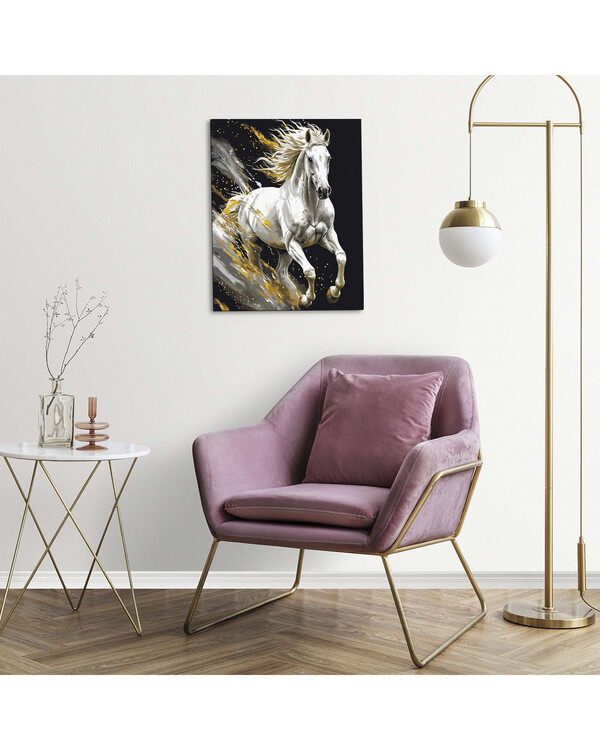 Et kraftfullt motiv av en staselig hvit hest i full galopp med gullskimrende detaljer.