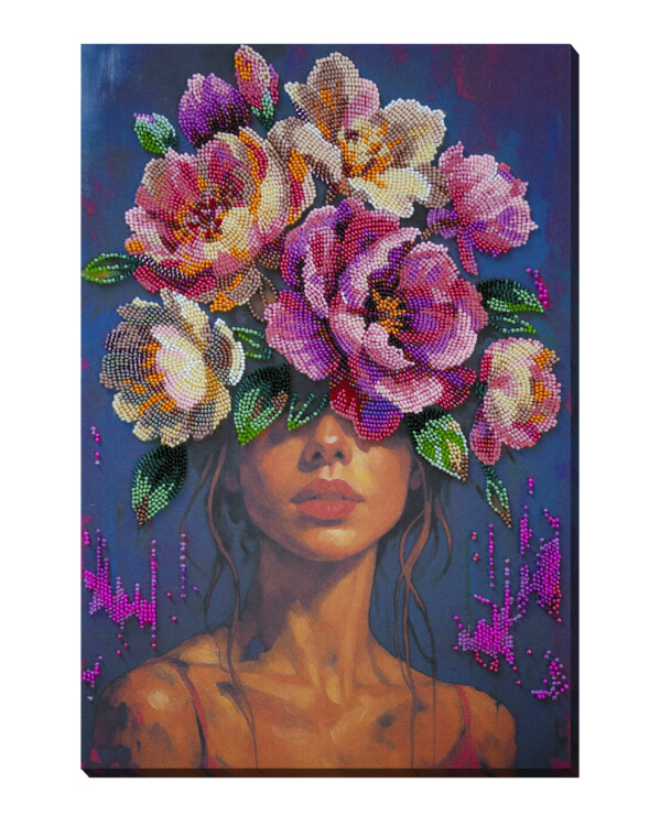 Dette perlebroderiet kombinerer kvinnelig mystikk og blomstrende prakt i en unik kunstnerisk tolkning.