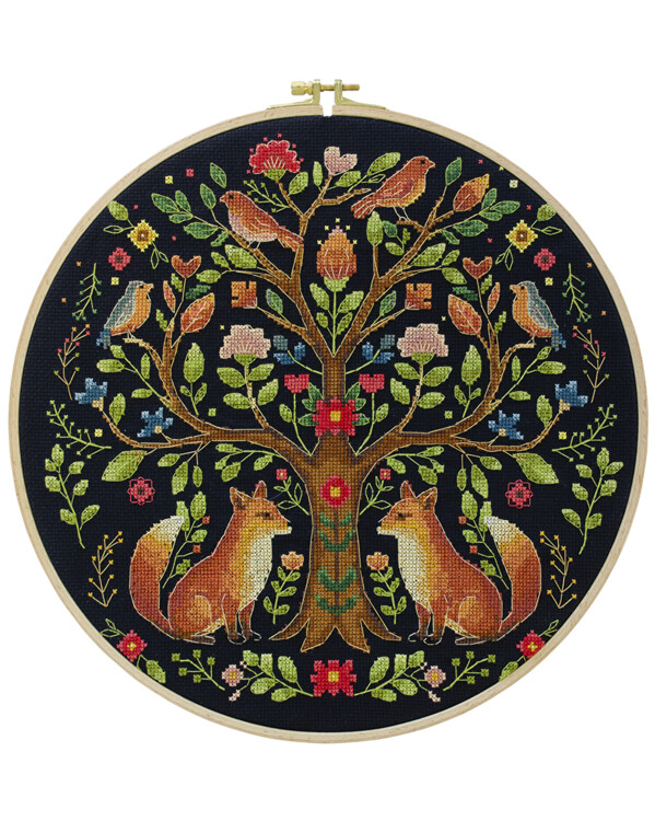 Et sjarmerende korsstingsbroderi med rever, fargerike blomster og fugler i et stilisert tre.