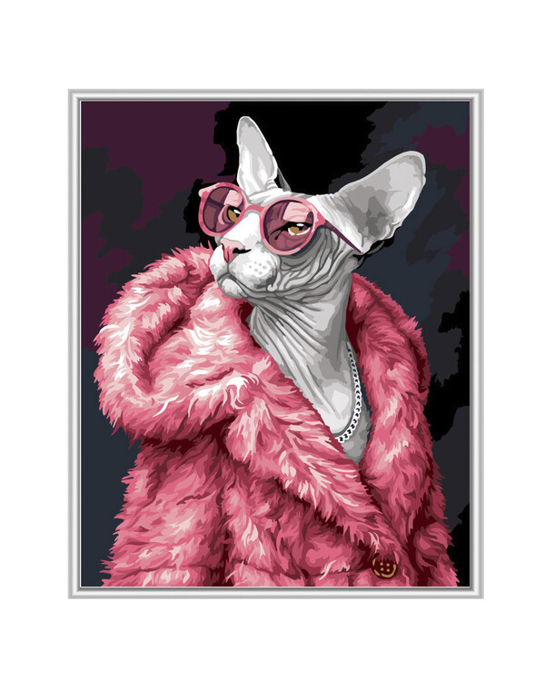 Kattmotiv med stil – en elegant sphynx-katt i rosa pelsjakke og solbriller. Et trendy og humoristisk motiv som blir et b...