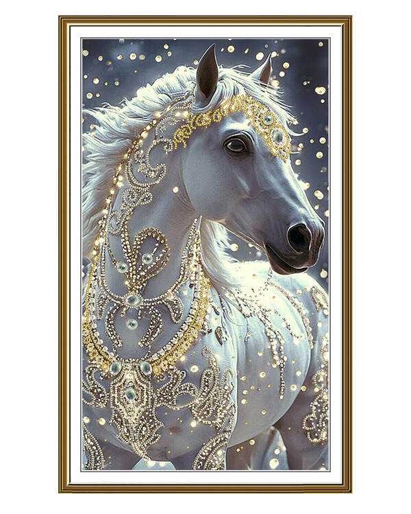 Den hvite hesten med glitrende gulldetaljer og perlelignende edelstener utstråler både mystikk og kongelig prakt.