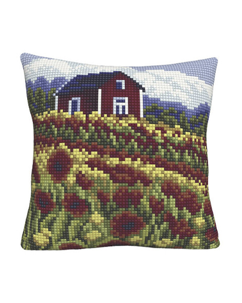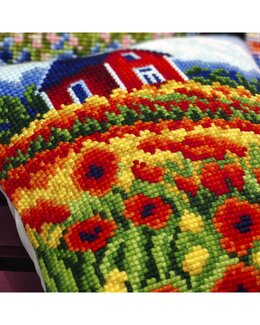 Lag et fargerikt og personlig putetrekk med denne broderipakken som viser en idyllisk rød hytte omgitt av et hav av valmuer og gyldne blomster.
