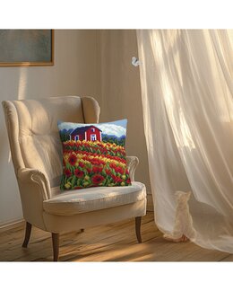 Lag et fargerikt og personlig putetrekk med denne broderipakken som viser en idyllisk rød hytte omgitt av et hav av valm...