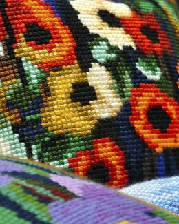 Broderes med akrylgarn i herlige farger på grov stramei der motivet er påmalt.