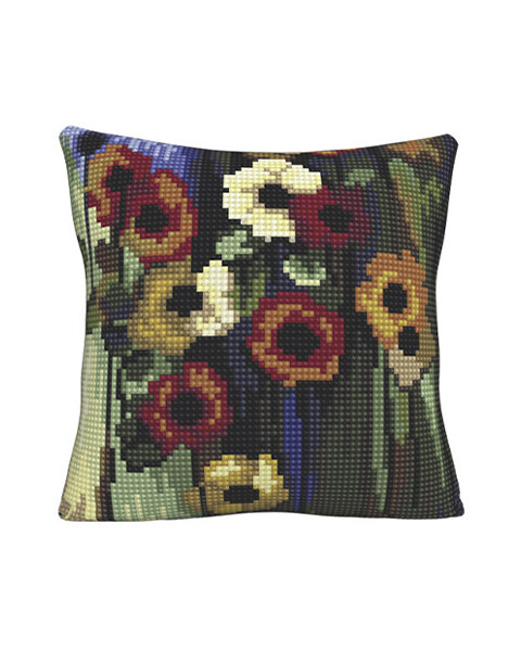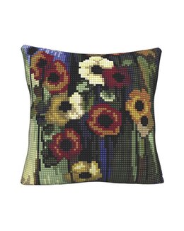 Fargerik pute med blomstermotiv som lyser opp ethvert rom. De dype røde, gule og oransje tonene kombinert med mørke kontraster gir et uttrykksfullt og kunstnerisk inntrykk.