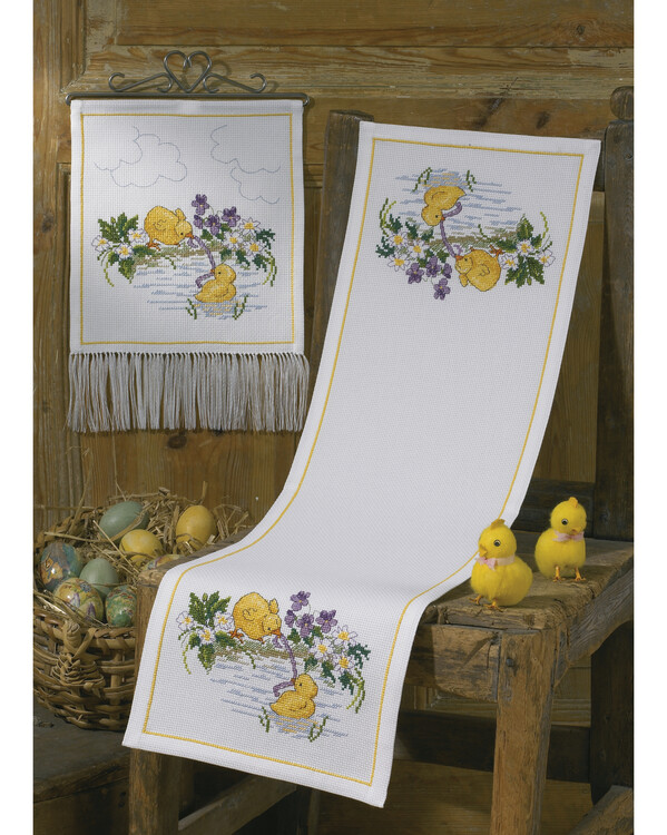 Broder denne søte løperen med små kyllinger ved dammen, fra Permin! Broderes med moulinégarn i utregnede kors- og atte...